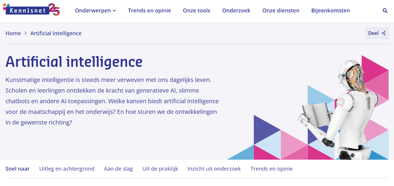 Kennisnet heeft een aantal interessante paginaβs over AI en onderwijs. Hieronder een selectie: