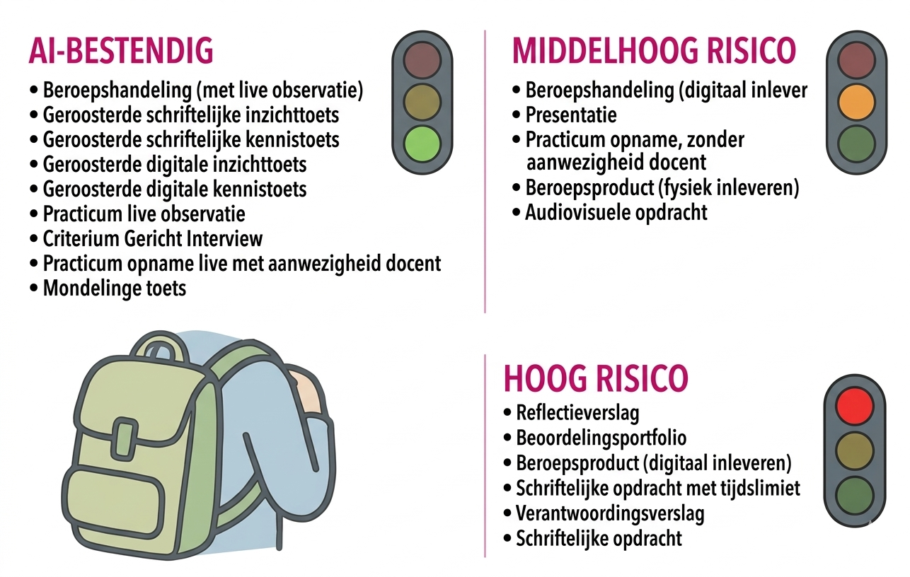 Authentieke producten: Hier ligt de focus op contextuele opdrachten die AI niet ‘weet’ (bijv. een analyse van een specifieke casus op de eigen werkplek). Belangrijk is aangetoond kan worden dat de uitwerking geen resultaat is van een prompt, maar van de student zelf.