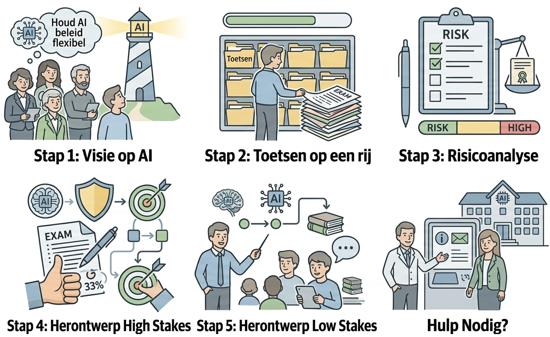 - Wat verandert er als de student AI gebruikt? Wordt de taak triviaal? Dan moet de taak verzwaard worden richting evaluatie en synthese in plaats van alleen reproductie.