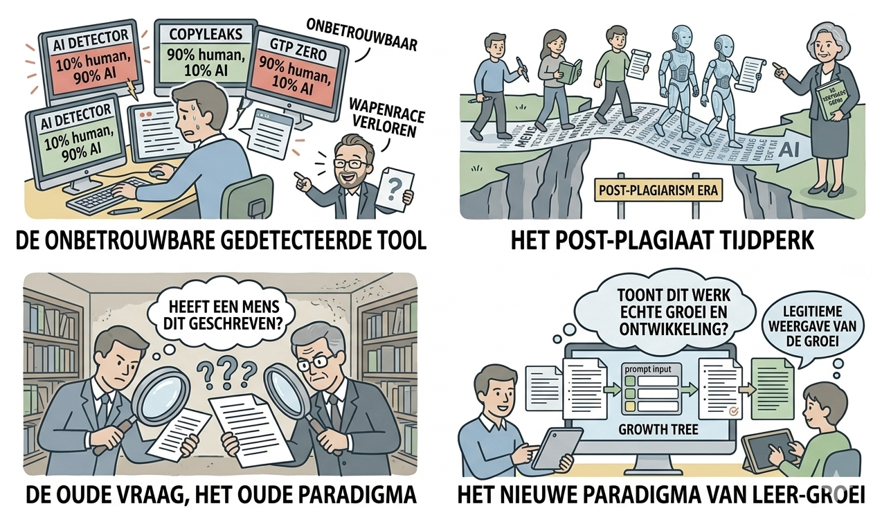 Lubach wist het: detectietools voor het gebruik van AI door studenten zijn onbetrouwbaar. En je komt als docent in een wapenrace terecht die je toch niet kunt winnen. Sarah Elaine Eaton (Universiteit van Calgary) noemt het het “post-plagiarism era”. Een tijdperk waarin de grens tussen menselijke en AI-tekst onherstelbaar is vervaagd. De verschuiving: We vragen niet langer “Heeft een mens dit geschreven?”, maar “Is dit werk een legitieme weergave van de groei van deze student?”.