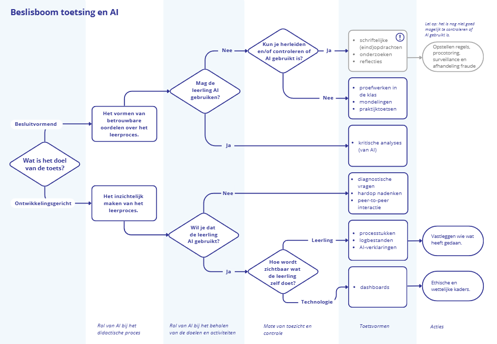 De Beslisboom Toetsing en AI van Kennisnet helpt bij het maken van bewuste keuzes per toetsmoment. Er wordt soms van 2-sporenbeleid gesproken, je zou ook kunnen zeggen dat er 3 sporen zijn doordat je AI ook kunt inzetten als instrument ter ondersteuning van het leerproces.
