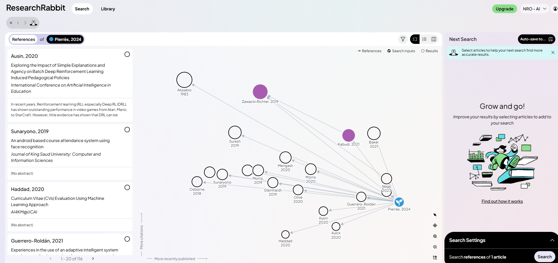 Je kunt beginnen met een paar publicaties die je al kent en Research Rabbit zoekt dan naar publicaties die daar naar verwijzen, van waaruit verwezen word of die thematisch lijken op het artikel dat je toevoegt. Hierboven in de afbeelding zie je het resultaat voor de review van Pierrès et al. (2024). Research Rabbit heeft het moeilijk met de enorme stroom artikelen die er over AI verschijnen. De review over Gao & Tan (2025) levert bijvoorbeeld niets op. Die kent de database nog niet.