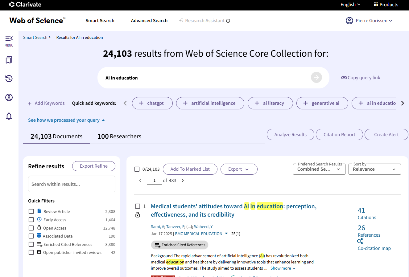 Daar komt voor AI in het onderwijs bij dat het aantal publicaties dat beschikbaar is, enorm is. Zelfs als je niet in Google Scholar zoekt, maar bijvoorbeeld in Web of Science zoals in de screenshot hieronder, dan kom je al gauw duizenden publicaties tegen, waarvan een groot deel (dik 10.000) alleen al uit 2025.