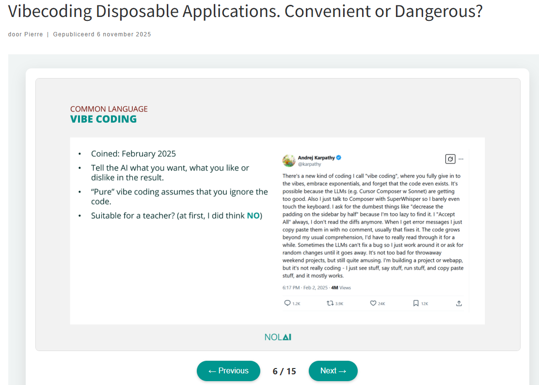 In de presentatie die ik daarover bij NOLAI verzorgde in november 2025, leg ik uit dat ik eerst zelf ook dacht dat het niks voor een leraar was. In de screenshot hierboven zie je dat ik verwijs naar een Tweet (=bericht op X) van februari 2025 waarin Andrej Karpathy, een van de opdrichters van OpenAI, enthousiast vertelt over ‘vibecode’ en ‘disposable applications’.