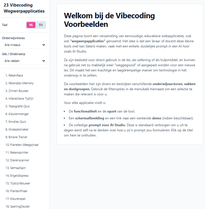 Voor de sessie bij NOLAI in november heb ik een pagina met 23 single prompt voorbeelden gemaakt. In het Nederlands en het Engels, met een beschrijving, een screenshot, een live (werkende) demo en de prompt die ik gebruikte. Met selectiemogelijkheid om te kiezen tussen Engels en Nederlands. En filters voor onderwijsniveau (NOLAI richt zich op funderend onderwijs, dus geen mbo/hbo voorbeelden op die pagina). Dat had ik nooit voor elkaar gekregen zónder dat ik ook vibecoding gebruikt had bij het samenstellen van die pagina en die voorbeelden. En dat is nu precies het punt dat ik wil maken.