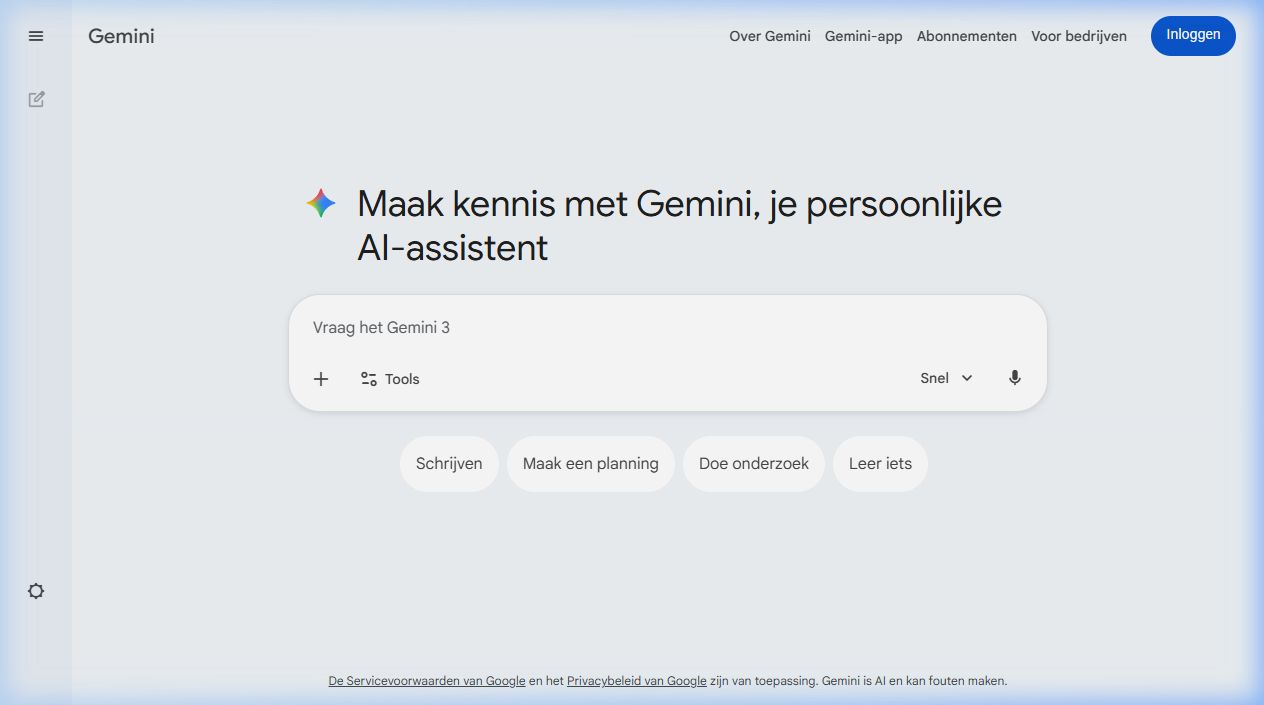Net als ChatGPT kan Gemini van alles, denk aan: Chatten over vrijwel elk onderwerp (al dan niet met opzoeken van info op internet), documenten samenvatten die in je Google Drive staan, mails opgstellen in Gmail of analyses uitvoeren op je data in Google Sheets (eigen ervaring is dat het nog niet heel indrukwekkend is). Je kunt via Deep Research uitgebreidere zoekopdrachten laten uitvoeren, nieuw is dat Gemini een NotebookLM notebook als basis neemt bij de zoekopdracht. Je kunt afbeeldingen genereren via Nano Banana, videoโs genereren via Veo 3.1, live gesprekken voeren via Gemini Live en AI Studio gebruiken om met de Gemini-modellen te experimenteren.
