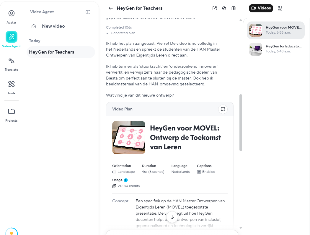 De enige input die Heygen hier gekregen heeft was de URL van de MOVEL pagina bij de HAN. Geen prompt, geen instructies. Wel heb ik 2 van de standaard avatars gekozen, maar dat was het dan ook. De rest is volledig automatisch gegaan.