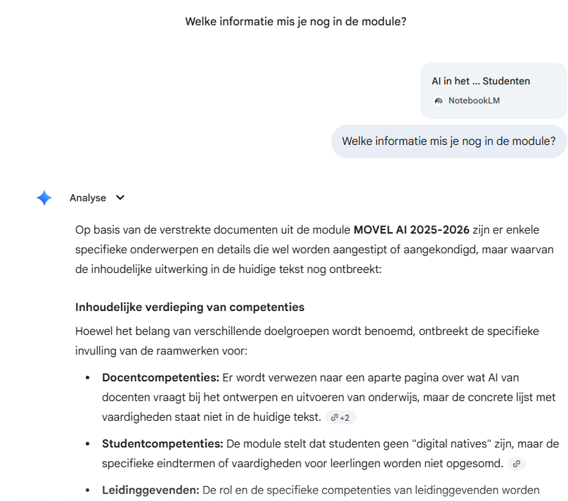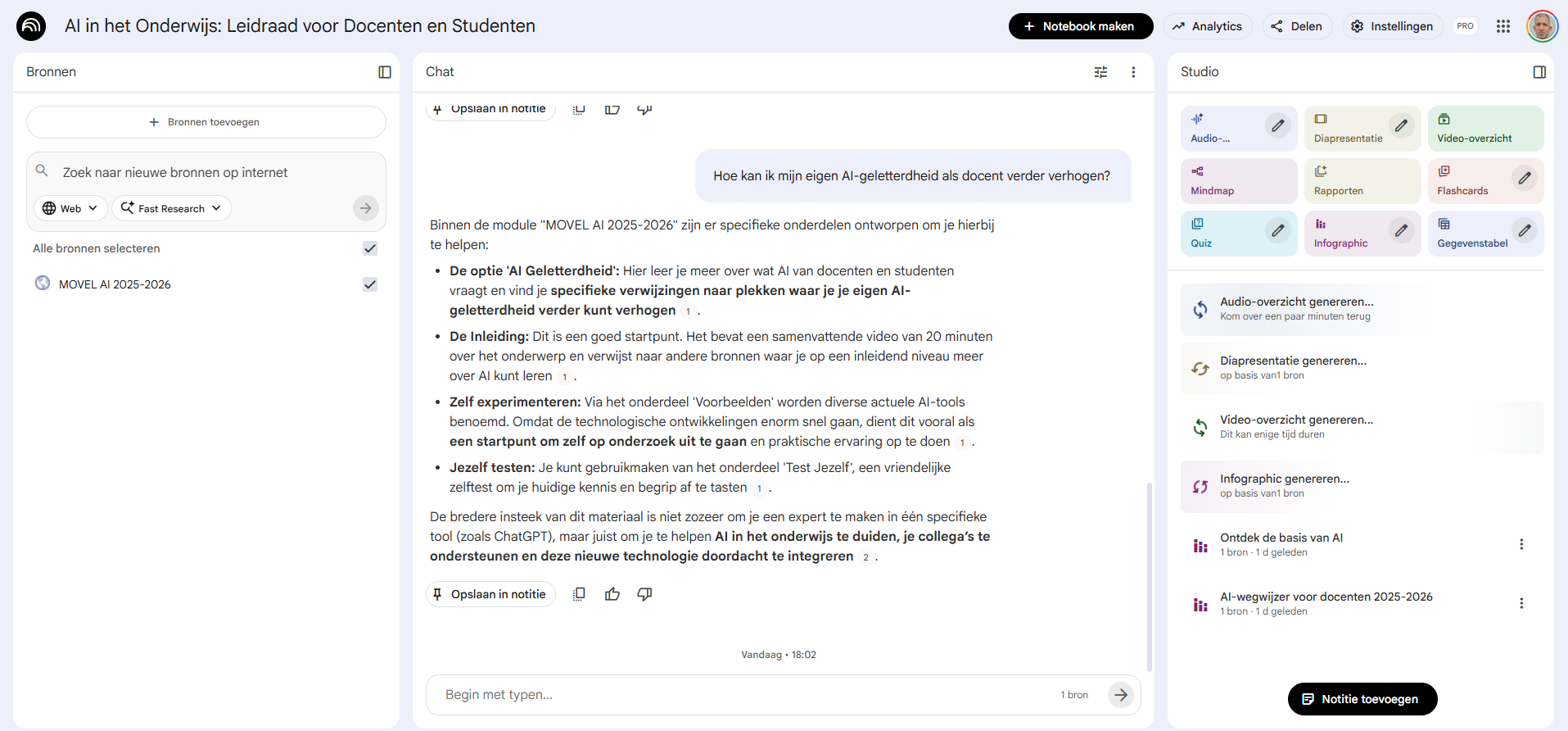 Het mooie is dat je een hele verzameling bronnen bij elkaar kunt bewaren en daar dan vragen over kunt stellen. Je kunt het notebook tegenwoordig ook als bron gebruiken in Gemini.