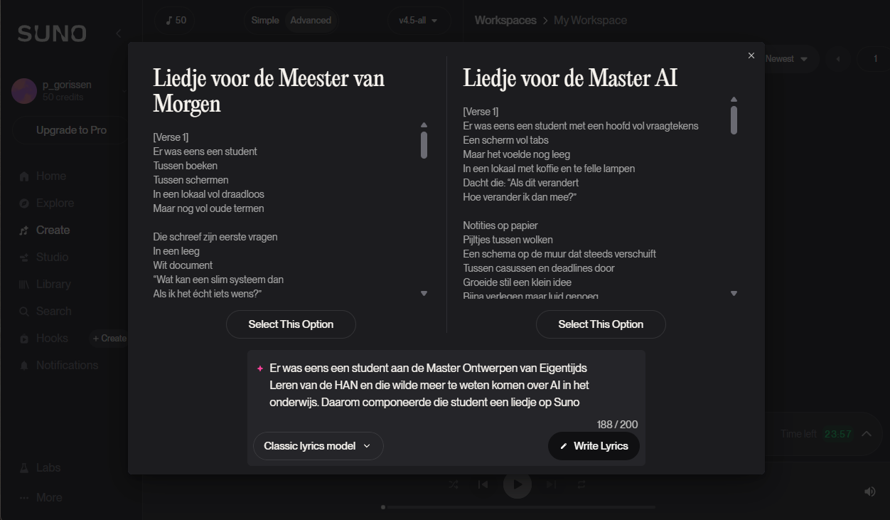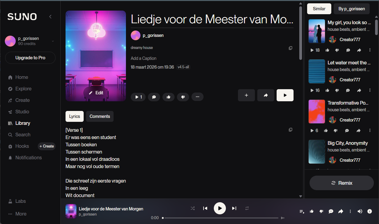 Je kunt ook zelf de tekst schrijven en Suno vragen die op muziek te zetten, dan heb je meer controle over de inhoud. Met de gratis optie krijg je 50 credits per dag, genoeg voor ongeveer 10 nummers.